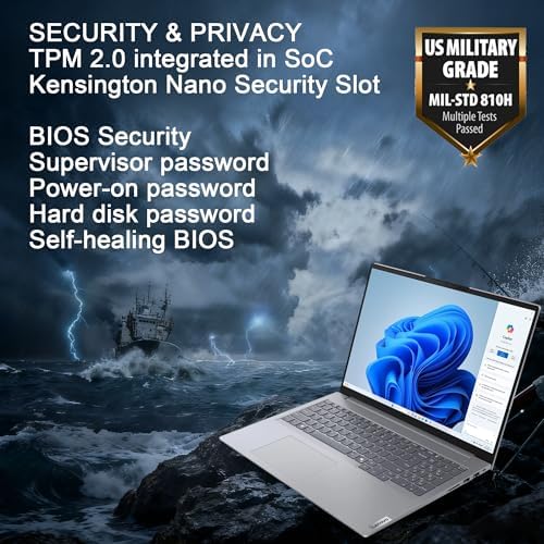 VERSATILE CONNECTIVITY – This ThinkBook 16 is equipped with 2x USB-C, 2x USB-A, HDMI 2.1 (up to 4K@60Hz), RJ-45 Ethernet, and a SD Card Reader. It also enables 3-monitor expansion via HDMI and dual USB-C ports. Includes Wi-Fi 6 and Bluetooth 5.3 for fast, reliable wireless performance. HD 720P Webcam with Privacy Shutter, fingerprint reader & TPM 2.0 for boosted security