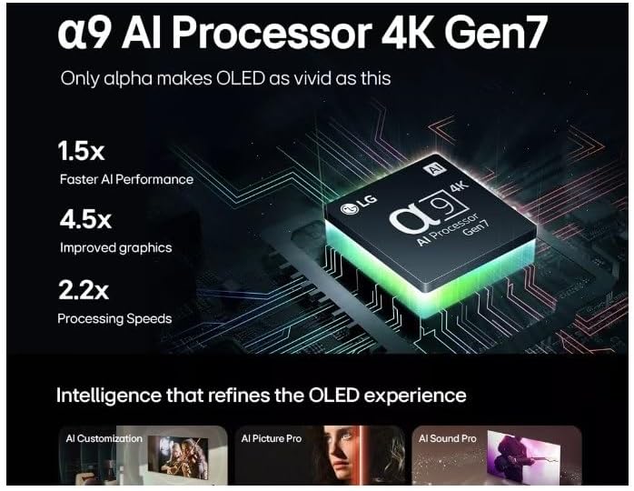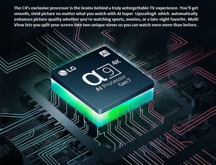 A9 AI Processor GEN7: The C4’s exclusive processor is the brains behind a truly unforgettable TV experience. You’ll get a smooth, vivid picture no matter what you’re watching with AI Super Upscaling, which automatically improves picture quality whether you’re watching sports, movies, or a late-night favorite. Multi View with 2 screens lets you split your screen into 2 unique views so you can see even more than before – it all looks and sounds amazing on an LG OLED TV.