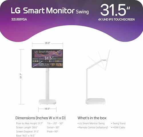 Seamless Flexibility for Work and Play – Experience powerful flexibility with the LG Smart Monitor Swing. Featuring a rolling stand and 360-degree adjustability, the 31.5” 4K touchscreen monitor reimagines how you work, watch, and play with stunning clarity and smooth touchscreen control.
