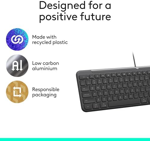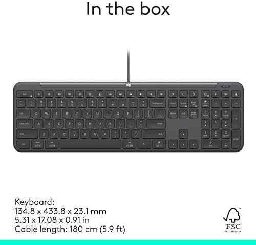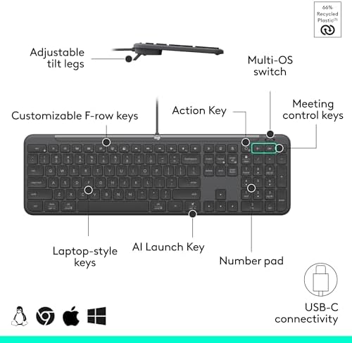 Signature Slim Wired K620 for Business offers an improved user experience for workplaces that require wired solutions. The USB-C keyboard delivers high-quality typing with laptop-style keys, thoughtfully designed with a subtle scoop for typing precision. Elevate productivity with preset shortcut keys like AI Launch Key for instantly accessing AI tools (5) or meeting control keys to quickly mute yourself or turn off the video. (4) Customize the shortcuts easily with Logi Tune (1), too. It works with Windows, MacOS, and ChromeOS, and comes with an OS toggle switch, which allows IT to easily deploy the keyboard across the enterprise. View and check device status at a centralized level with Logitech Sync. (6) Designed with sustainability in mind, the keyboard improves power efficiency by consuming 49% less energy compared to the K120 keyboard. The plastic parts are made with 66% post-consumer recycled plastic (3) and the product is shipped in FSCTM-certified paper packaging.