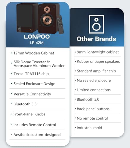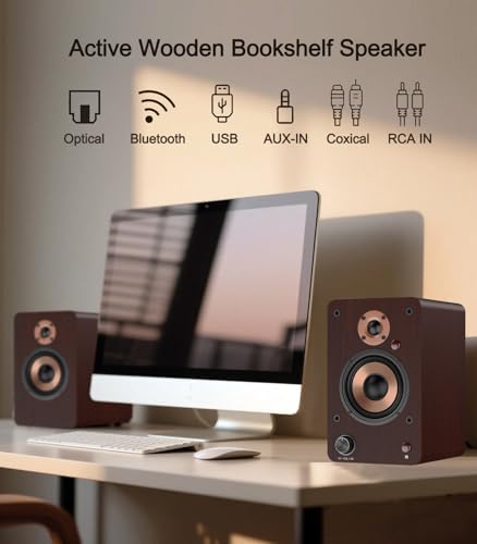 Versatile Connectivity: ① LP42M bluetooth bookshelf speakers Support Bluetooth 5.4 technology, allowing you to wirelessly stream your favorite music from your smartphone, tablet, or other Bluetooth-enabled devices. ② USB cable and flash drive connections, make connecting to PCs via USB easier than ever. ③ With Optical, Coaxical, RCA (1V), 3.5mm AUX inputs, Perfectly compatible with mini turntables, TVs, Desktops, Computerand laptops for an immersive sound experience.