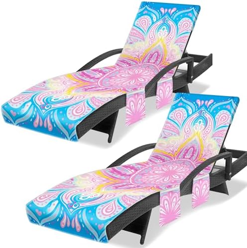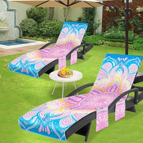 Lounge Chair Towel Cover, Chaise Lounge Cover (Pack of 2), Beach Chair Covers with 3 Pockets for Trips Beach Pool Garden Sunbathing Courtyard, 85 x30 in, Mandala Style Pink Blue