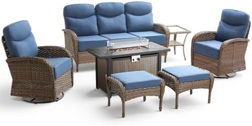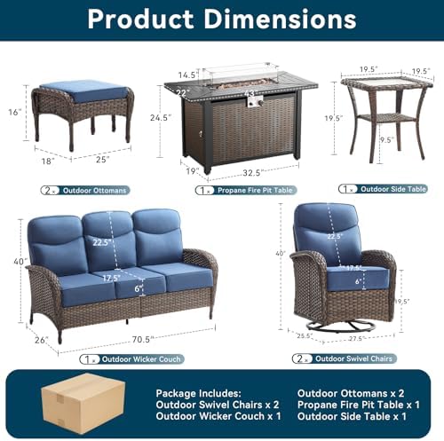 【Outdoor Patio Furniture Sets】Our outdoor furniture set consists of 1 outdoor sofa, 2 patio chairs, 2 ottoman, 1 fire pit table and 1 side table. You can arrange the outdoor patio furniture according to your space needs. Whether you have a small or large area, this set outdoor patio furniture can adapt to different space sizes, allowing you to freely create the outdoor seating arrangement you desire. Ideal for patio, deck, garden and poolside, it’s a versatile outdoor furniture choice for you