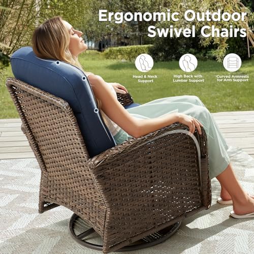 【360°Swivel & Glider Back and forth】The heavy-duty base of these outdoor swivel glider chairs features a unique design that allows for a smooth 360° rotation and gliding motion. You can effortlessly rock back and forth while enjoying a full range of movement. Perfect for relaxing with family and friends, these chairs offer an ideal spot for conversation, drinks, and unwinding, this patio seating lets you fully embrace the comfort and beauty of outdoor living spaces.