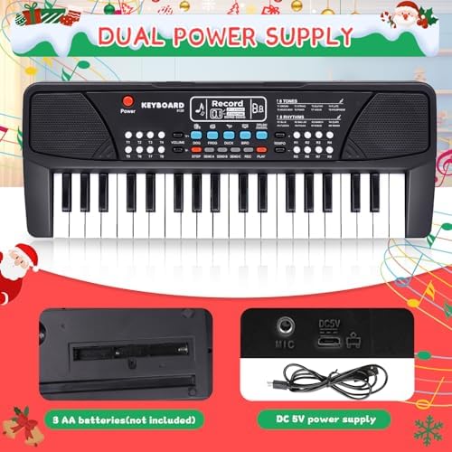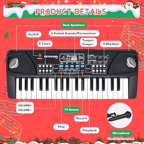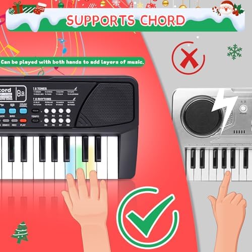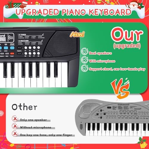 Upgraded Kids Piano: 37 keys kids piano keyboard with record playback function, dual speakers, support chord playing, and a microphone behind the keyboard.