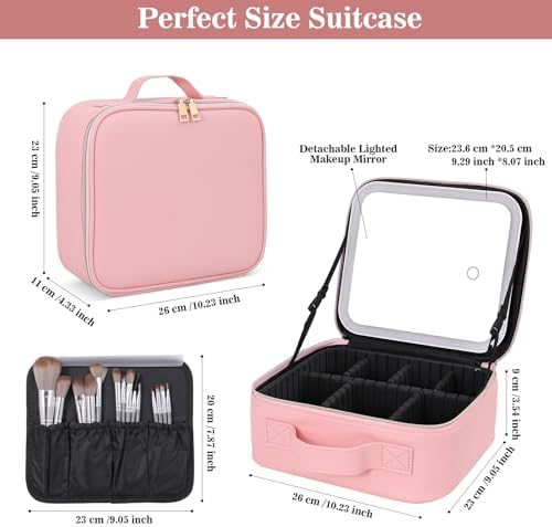Stylish Travel Makeup Bag with LED Mirror:This kind Waterproof makeup bag with mirrorsr combines fashion and functionality, crafted from premium PU leather with scratch-resistant carbon fiber lining. Perfect as a travel makeup bag, its 10.23×9.05×4.33-inch spacious interior securely holds all your make up essentials, brushes, and cosmetics. The sleek design and ergonomic handle make it ideal for on-the-go touch-ups during work, travel, or shopping trips