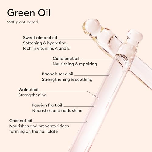 Mini Cuticle Oil for Nails Green Oil : This nail oil for growth and strength is perfect for soothing the nail contour and nourishing dry cuticles. Enriched with 6 botanical oils, this nail growth oil regenerates nails to promote growth. After 1 week of use, nails and their surrounding skin are deeply nourished, fully hydrated, and protected from daily aggressions.