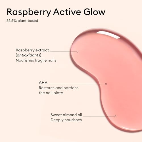 Active Glow Raspberry Quick Dry Nail Polish : Active Glow nail polish is a hybrid between treatment and makeup, this all-in-one perfecter delivers a mirror-bright glow. Bio-sourced at 85.5%, it regenerates and nourishes nails thanks to its formula enriched with blueberry extract and sweet almond oil. Makeup effect: peachy pink gloss with a mirror shine finish.