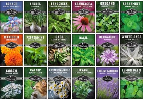 18 MEDICINAL HERB SEEDS – English Lavender, Roman Chamomile, Purple Coneflower Echinacea, Peppermint, Spearmint, Common Sage, White Sage, Lemon Balm, White Yarrow, Catnip, Marigold, Oregano, Holy Basil Tulsi, Bergamot, Borage, Fennel, Fenugreek, and Lovage