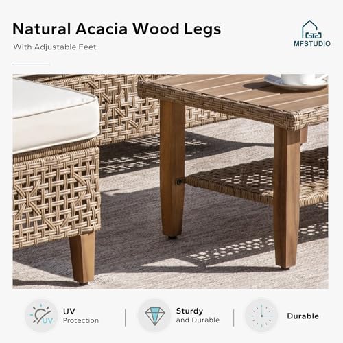 L-Shaped Outdoor Couch – MFSTUDIO l shaped patio couch includes two bench-style sofa and a wood table, being perfect for any alfresco space. The unique yellow gradient woven rattan pattern and beige cushions create an elegant bohemian vibe