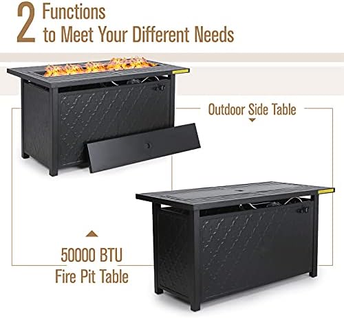 Multi-function Fire Pit Table: Outdoor conversation set apply 45″ rectangular fire pit table, which provides 50,000 BTU heat output to creat a safe, warm and romantic atmosphere. This fire pit table can be used as an outdoor dining-table, bar table, coffee table etc. easily by covering the lid provided when not burning. The base of the firepit easily hides away a 20lbs propane tank (not included)