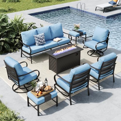 8 Pieces Outdoor Conversation Set: MFSTUDIO blue color metal patio furniture set includes 1 x deep seating 3-seater loveseat sofa, 2 x swivel patio chairs, 1 x 45″ gas fire pit table and 2 x cushioned ottoman. The ottoman can also be used as a footstool, a seat, or instead of the coffee table. So, such a set can seat 5-7 person