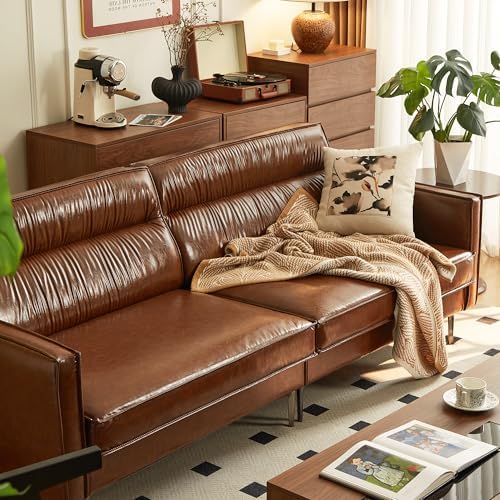 【Classic Vintage Design with Ultimate Comfort】 This luxurious sofa combines a mid-century vintage design with optimal comfort. The thick seat cushions are filled with high-density foam, ensuring plushness and perfect support for the seat, backrest, and armrests. Whether you’re relaxing or hosting guests, this thoughtful design guarantees a comfortable and cozy seating experience. The detailed stitching exudes sophistication, while the padded leather surface becomes the focal point of timeless beauty in any room or living space.