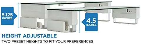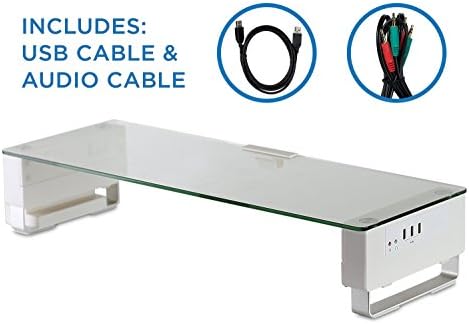 HEAVY DUTY MONITOR HOLDER – The 3/8″ thick tempered glass is tested to hold a whopping 66 lbs with sturdy aluminum legs while maintaining a slim monitor riser profile. This USB monitor stand is designed to carry the largest 27, 30, 32 inch monitors as well as LED television. Dimensions are set at 22″ (Length) x 9″ (Depth) x 3″ (Height).