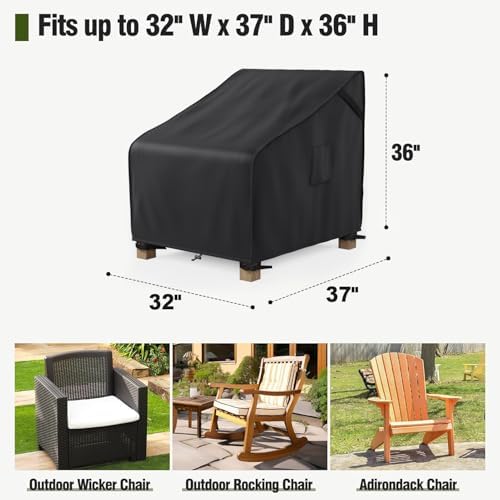 【Universal Fit】This patio chair cover is suitable for outdoor rocking, Adirondack, and wicker chairs up to 32″W x 37″D x 36″H. Note: measure your chair and choose a cover 1-3 inches larger before purchasing
