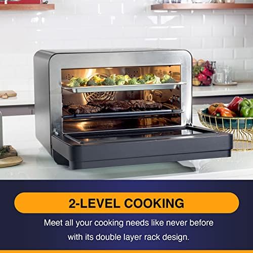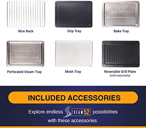 Steam, Steam-Bake, Air fry, Grill, Broil, Dehydrate in this multifunction oven Precise temperature control (104°f – 446°f ) delivers consistent cooking results Intuitive, easy to use touch control panel displays with large LED display, and one-touch functions Multiple preset menu programs allow you to Broil, Grill, Roast, Toast, Dehydrate, Proof, Reheat Airfry to crispy perfection on the outside while soft on the inside 3 levels for multilevel cooking trays. Great for reheating Accommodates family size meals to personal size meals Large capacity: 23 liter / 0.81 cu. ft. capacity; large water tank capacity: 0.8 liter / 27.05 oz Stainless steel interior for easy cleaning