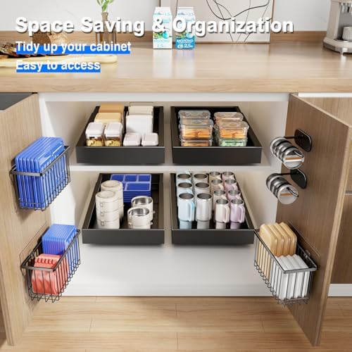 【𝐒𝐩𝐚𝐜𝐞 𝐒𝐚𝐯𝐢𝐧𝐠 & 𝐄𝐥𝐢𝐦𝐢𝐧𝐚𝐭𝐞 𝐂𝐥𝐮𝐭𝐭𝐞𝐫】The cabinet organizer storage contains 2 baskets and 2 lid holders to provide an extra storage organizer for slim space, neatly and orderly organize and store your food container lids and tumbler lids, easy to access, no longer time-consuming and laborious to find scattered and messy lids, Make the kitchen cleaner and less cluttered.