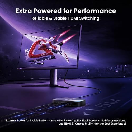 HDMI 2.1 Switch with Advanced Features: Supports HDR10+, Dynamic HDR, Dolby Vision, VRR, and ALLM for immersive visuals and ultra-responsive gaming. The HDMI Splitter function ensures compatibility with high-end TVs and monitors, eliminating screen tearing and input lag.
