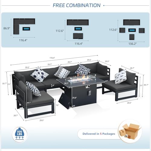 Set Includes: This 7-piece outdoor sectional furniture set includes one fire pit table, four armless chairs, and two corner chairs, in addition, we also put one pc of table cover, one set wind guard, and 18 lbs glass beads in the fire table box; These modular pieces can be organized at your preference