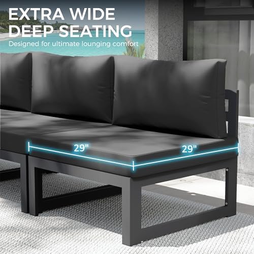 Extra Wide & Deep Seating: This outdoor patio set features sofa seats that are 29 inches wide and deep, providing extra-large space for a comfortable seating experience; It includes three-layer memory foam cushions that are 4.1 inches thick and won’t sag over time; The patio sectional furniture cushion covers are removable and machine washable, making maintenance simple