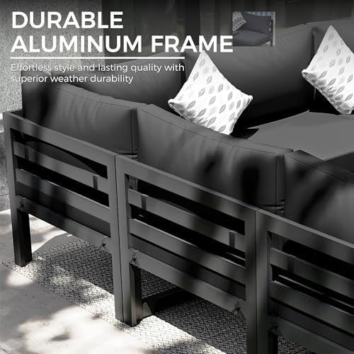 Modern & Durable Strength: Experience a luxurious and modern aesthetic with this outdoor furniture set; Designed with full-aluminum frames and a super-weather-resistant powder coating, it effectively resists rust and corrosion; Precision-welded extruded tubing and reinforced stress points keep the structure lightweight yet impressively strong and stable, supporting up to 500 lbs; A perfect choice for anyone seeking a luxurious and durable patio sofa set