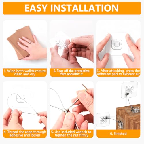 Easy Installation & Quick Release: No drilling, screws, or tools needed. Simply clean and dry the surface, apply the adhesive, and secure the cable. Installation can be completed in minutes. The detachable furniture wall straps with Screw Tightening Design allow easy release for cleaning or furniture removal.
