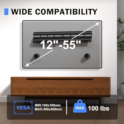 WIDE COMPATIBILITY: The universal studless TV wall mount fits most 12”-55”TVs with VESA patterns 100×100 to 400x400mm. Including LG, Samsung, Sony, Sharp, TCL, Roku, INSIGNIA, VIZIO and etc.