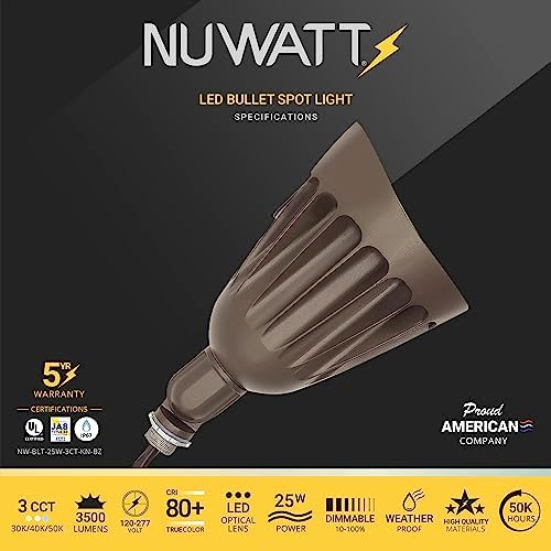 Color Changing Outdoor LED Spotlight – NuWatt bullet lights have 3000K Warm White, 4000K Cool White, or 5000K Daylight color temperatures. Change light color any time with a switch on our outdoor landscape spot lights