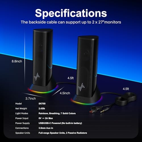 【Designed for Your Desk】Designed with a slim profile, these laptop speakers fit neatly on any desk. The extended 4.5 ft cable easily supports dual 27-inch monitors, keeping your workspace clean and organized.