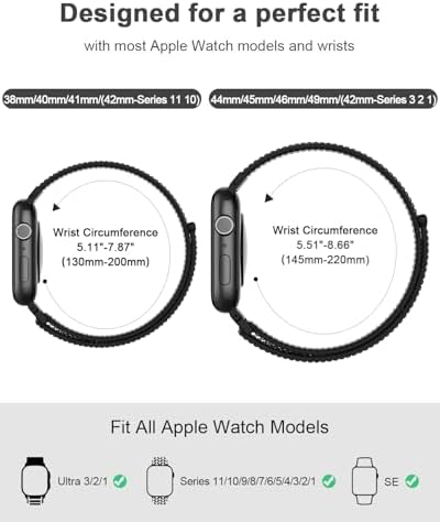 [Compatible Models] HEARTBOOM sports nylon iWatch bands for men and women are designed for iWatch all versions. Suitable for Apple Watch Ultra 3/2/1, SE 3/2/1, Series 11, Series 10, Series 9, Series 8, Series 7, Series 6, Series 5, Series 4, Series 3, Series 2, Series 1. Two size options: ① 44mm/45mm/46mm/49mm/(42mm-Series 3 2 1) size for 5.51″–8.66″ (145–220mm) | ② 38mm/40mm/41mm/(42mm-Series 11 10) size for 5.11″–7.87″ (130–200mm). Pls check the model on the back of your watch to select the correct size