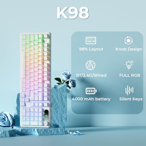 ⌨【Tri – Mode Connectivity for Unlimited Flexibility】The K98 wireless gaming keyboard offers three connection options: BT5.0, 2.4GHz wireless, and USB wired. Hold FN + 1/2/3/4/5 to switch among BT1/BT2/BT3/2.4G/wired modes. Seamlessly switch between tablet, laptop, and phone. Ideal for work, gaming, and study—no limits on how you connect.