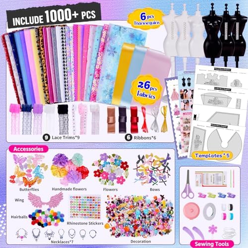 Full Set of Tools: More variety, more creativity; This fashion clothing designer kit includes everything you need, with 800+ pieces of materials to create 85+ unique outfits. The set features 6 dress mannequins, clothing templates, a tape measure, 26 fabric swatches, 6 trims, 6 ribbons, scissors, sewing tools, 100+ decorative flowers and bows, and 400+ other embellishments — perfect for endless creative possibilities!