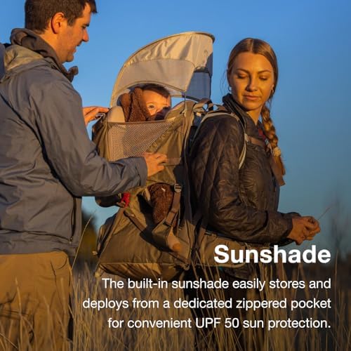 INTEGRATED UPF 50 SUNSHADE: A built-in sunshade deploys easily from a zippered pocket, providing sun protection during baby hiking adventures.