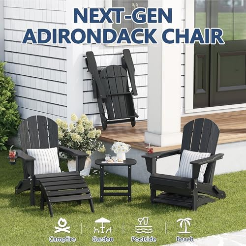 Outdoor Folding Adirondack Chair Set of 3 for Patio Fire Pit, Wooden Textured HDPE Adjustable Chairs with Cup Holder, Waterproof All Weather Resistant Plastic for Pool Lawn Garden Backyard(Black)