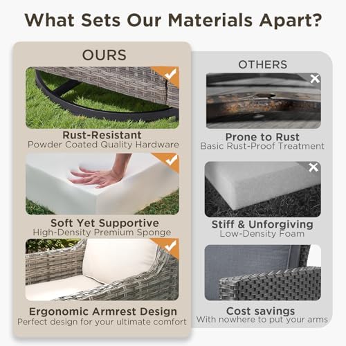 【Comfortable and Thick Cushion】Our wicker patio furniture features 4-inch thick cushions made with soft, high-density sponge that offers comfortable support and won’t flatten over time. The cushions are designed for long-lasting comfort, providing both softness and resilience. Covered in durable Olefin fabric, a professional outdoor material, they are water-resistant and built to withstand the elements, ensuring a comfortable seating experience for hours
