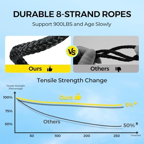 900LBS MAX SUPPORT: Built with ultra-strong 8-strand ropes, this tree swing supports up to 900 lbs, making it sturdy enough for everyone. The seat, crafted from durable interlocked 8mm ropes, retains its shape without much sagging—even under maximum weight. UV and wear resistant, this swing provides safe and long-lasting fun for your entire family.