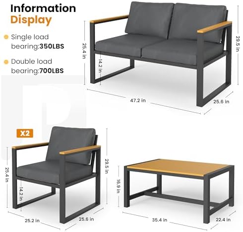 Sturdy Metal Frame: Built with thick iron tubing and additional back slats, the metal frame of the outdoor furniture is highly durable and rust-resistant, with a weight capacity of 350 lbs for each single seat and 700 lbs for the loveseat