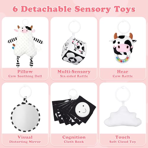 6 Sensory Toys: The 6 hanging toys promote the development of auditory, visual, tactile and self-awareness during play. This will effectively enhance the baby’s overall hand-eye coordination and sensory cognitive abilities.