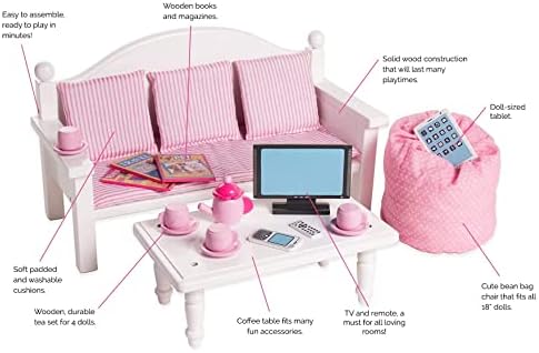 LIVING ROOM SET FOR RELAXING DOLL SPACES: This 18 inch doll furniture set includes a tea set, TV, phone, iPad, magazines, and a bean bag chair, offering kids endless play opportunities in a stylish, cozy living room setting.