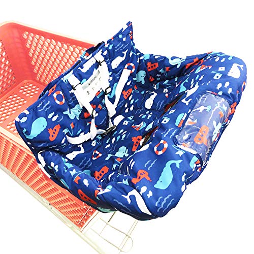 Universal fit both shopping cart and baby high chair. 5 point safety shoulder harness system added security. Soft cotton padding added comfort. Handy to carry with attached handbag. Machine washable.