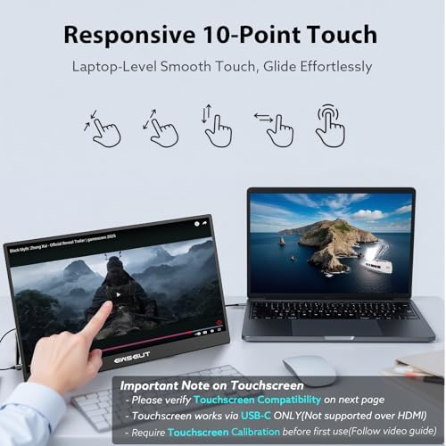 [10-Point Touchscreen]: This portable monitor features 10-point capacitive touch and is compatible with both Windows and macOS systems. MUST NOTE: For Type-C 3.1 DP ALT MODE or Thunderbolt 3/4 ports, a USB-C-C cable handles everything. For other ports, use HDMI+power cable+USB-A-C cable(for touch functionality).