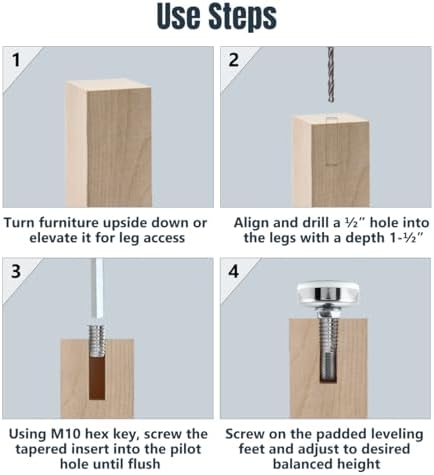 Simply pre-drill installation holes into the furniture at preferred site of attachment. Due to the wide variety of density and grain in wood, we recommend you test your insert in the same species of wood you are using for your project. To avoid damaging your threaded inserts, which are installed using a 10 mm hex wrench, you should start with a large hole (between ½” to 9/16”) and work your way down to the best fit. Once attached, adjust to the desired height with a 13mm hex wrench (not included).