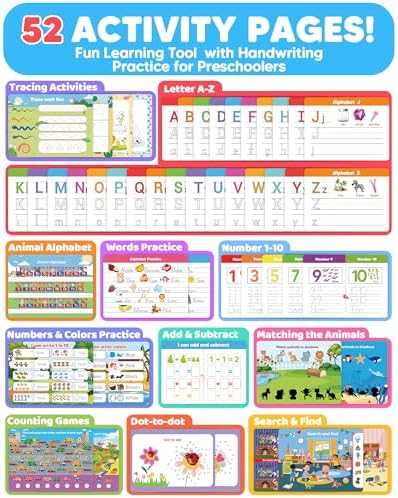 52 Activity Pages Workbook: This activity book for kids ages 3-5 provides children with a variety of tracing and handwriting practice, such as tracing the lines, learning letter, numbers, words, add & subtract, color & shape recognition, matching games, tracing and coloring, sorting games, and spot the difference, keeping the little ones engaged for a long time!