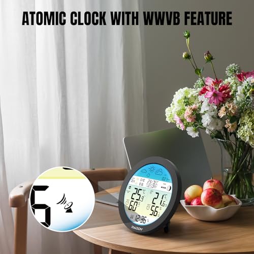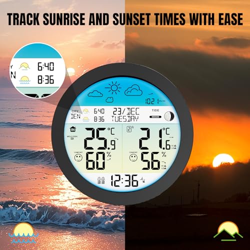 【All-in-One Weather Monitoring on a Smart Display】Track temperature, humidity (indoor/outdoor), 12-24 hour weather forecast, barometric pressure & trends, moon phases, tide info, calendar, and DCF radio clock—all on one elegant round display.