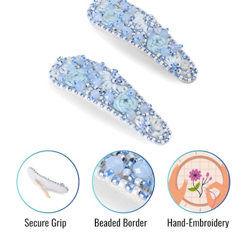 Each hair clip in this set of two is meticulously handcrafted by skilled artisans, featuring intricate embroidery in soft pastel shades of pink, blue, and yellow. The delicate beadwork adds a subtle sparkle, making these clips not only a beautiful accessory but also a unique piece of art that showcases exceptional craftsmanship.