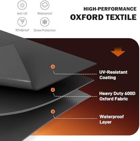 Air Vents and Secure: The 2 large vents are conducive to airflow and help reduce condensation inside the cover. The reinforced padded handle is easier to use. The built-in Elastic hem cord with toggles and 4 buckles is better to cover fit and fix on. It’s effective to face stormy weather and protect from being blown away.