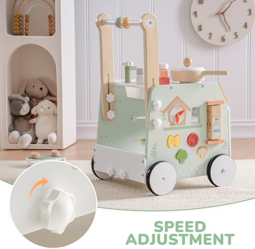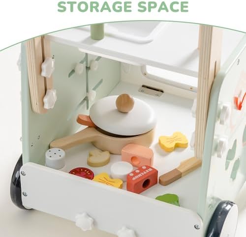 Modern and Engaging Aesthetic: With its fresh green color schemes and charming patterns, this baby walking toy is visually appealing and adds springtime vibes to your home. The toddler walker push toy with light food cooking kitchen with oven design sparks child’s curiosity and keeps toddlers entertained, making it a perfect addition to any playroom or living space.