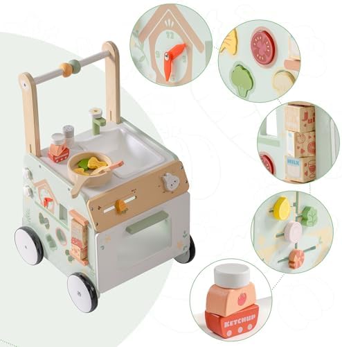 Multifunctional Baby Push Toy for Early Learning: The baby walker push toy is designed to support your child’s first steps with confidence. Equipped with an interactive activity panel featuring clock, shape matching, salad sliders and so on, this wooden baby push toy encourages color perception and cognitive development. The rear rack allows toddlers to carry their favorite toys, fostering a sense of companionship and making it one of the most engaging walking toys for 10m+ year old learning to walk.
