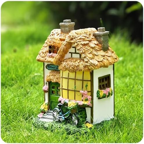 Meticulously crafted resin design with intricate details like chimneys, a bicycle, and blooming spring vines. Compact size: 9.06 x 7.68 x 5.63 inches – perfect for outdoor accents.