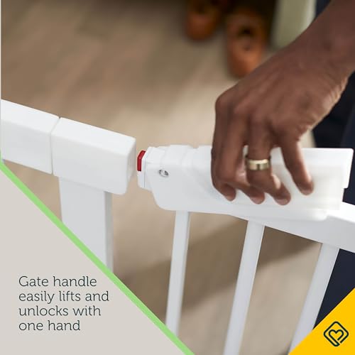 QUICK-LIFT HANDLE: Easily unlock the walk through baby gate with one hand. The sturdy handle design prevents little fingers from accidentally opening